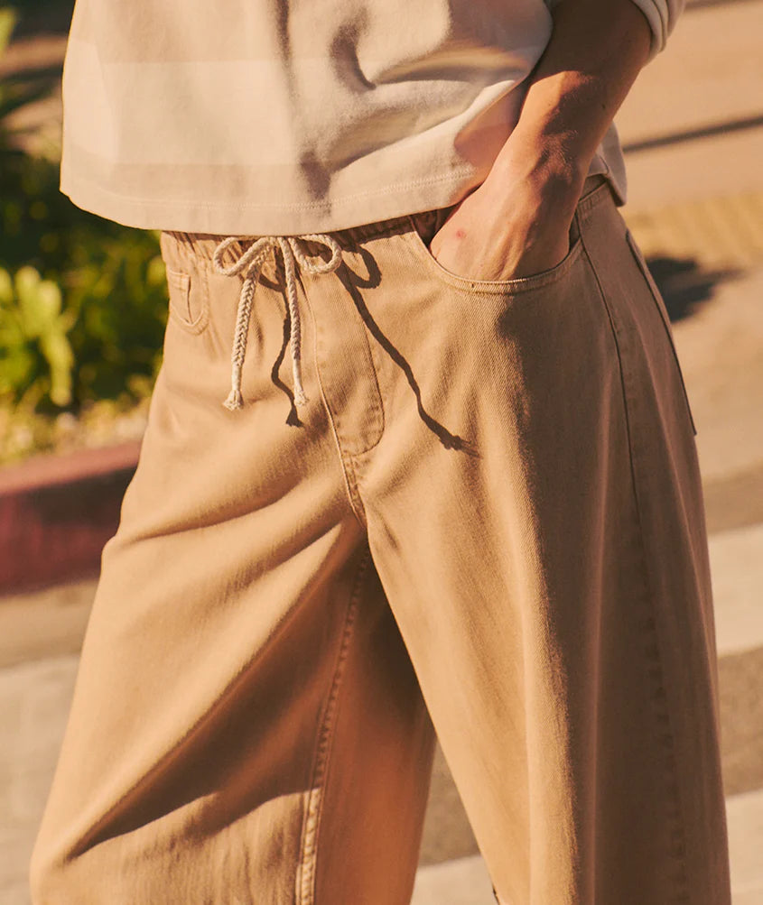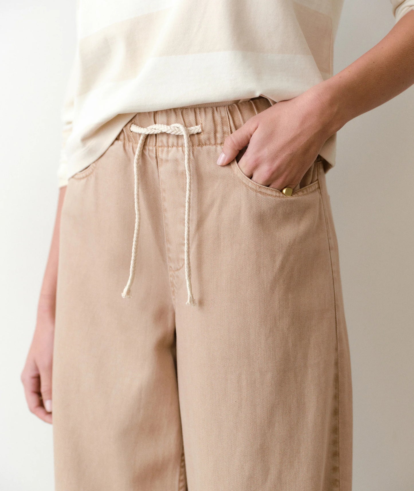 Women's khaki barrel leg pants with a pull-on drawstring waist