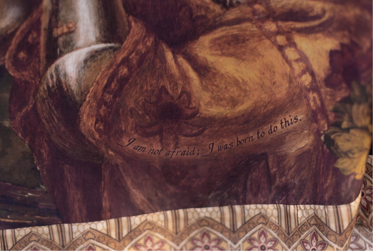 From Market Of Stars: "...A tribute to fearless conviction & celebration of those who dare to follow their hearts. Featuring Dante Gabriel Rossetti’s iconic final portrait of Joan of Arc, it honours her strength, resilience, and grace. The florals taken from centuries-old paintings, represent enduring beauty of faith and perseverance, while the trim — featuring a hand-coloured drawing of stained-glass church windows — pays homage to the sacred spaces where Joan found solace. The wise fox, painted in 1810, evokes the divine guidance she credited for her remarkable feats. Joan’s words (written on her sleeve in this print) reminds us to live our lives with courage, determination, and love."