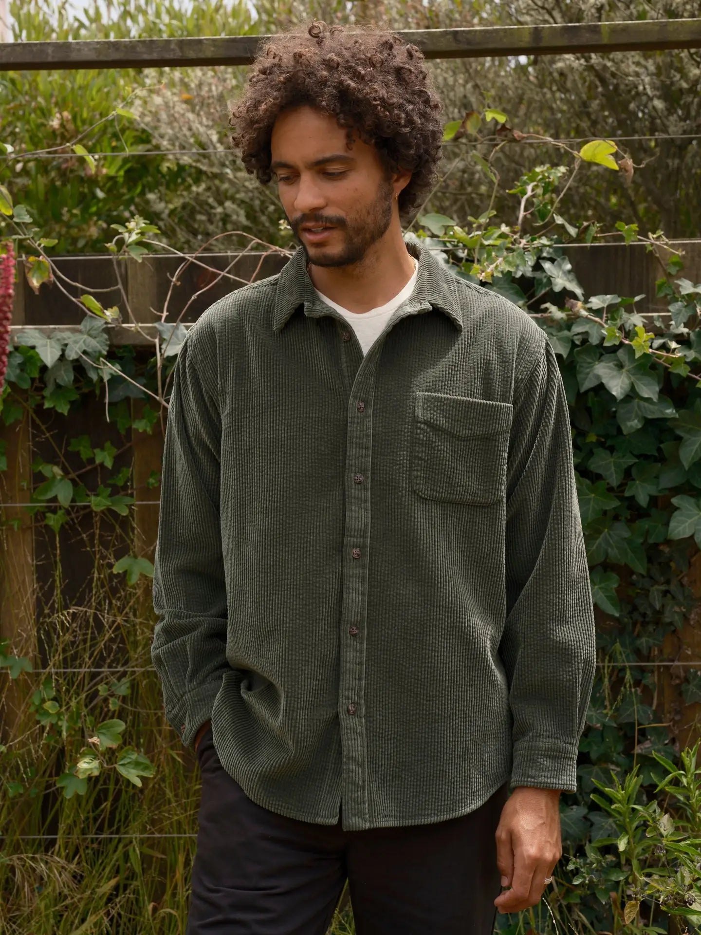 Men's long sleeve corduroy shirt with a collared neckline, front button closure and single chest pocket