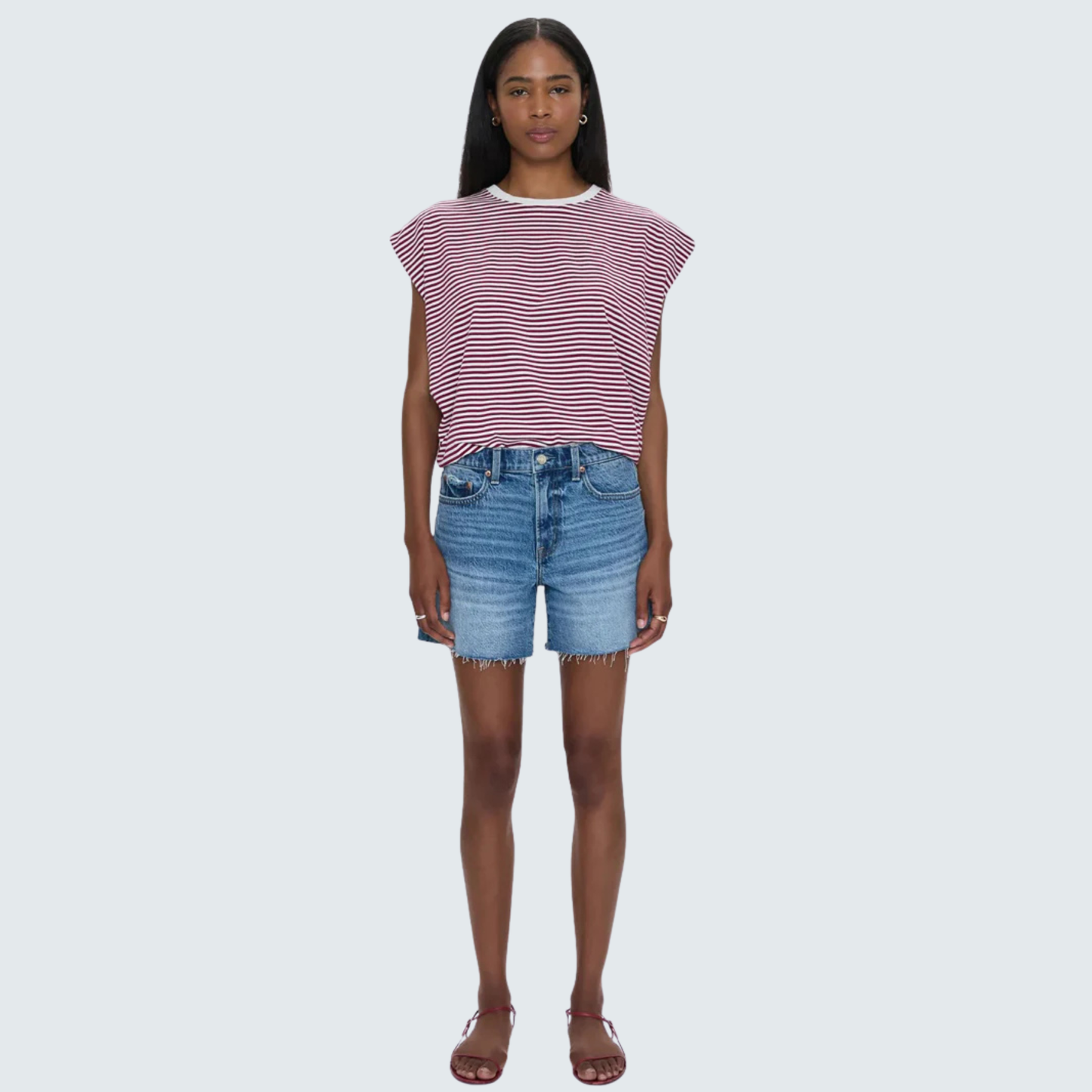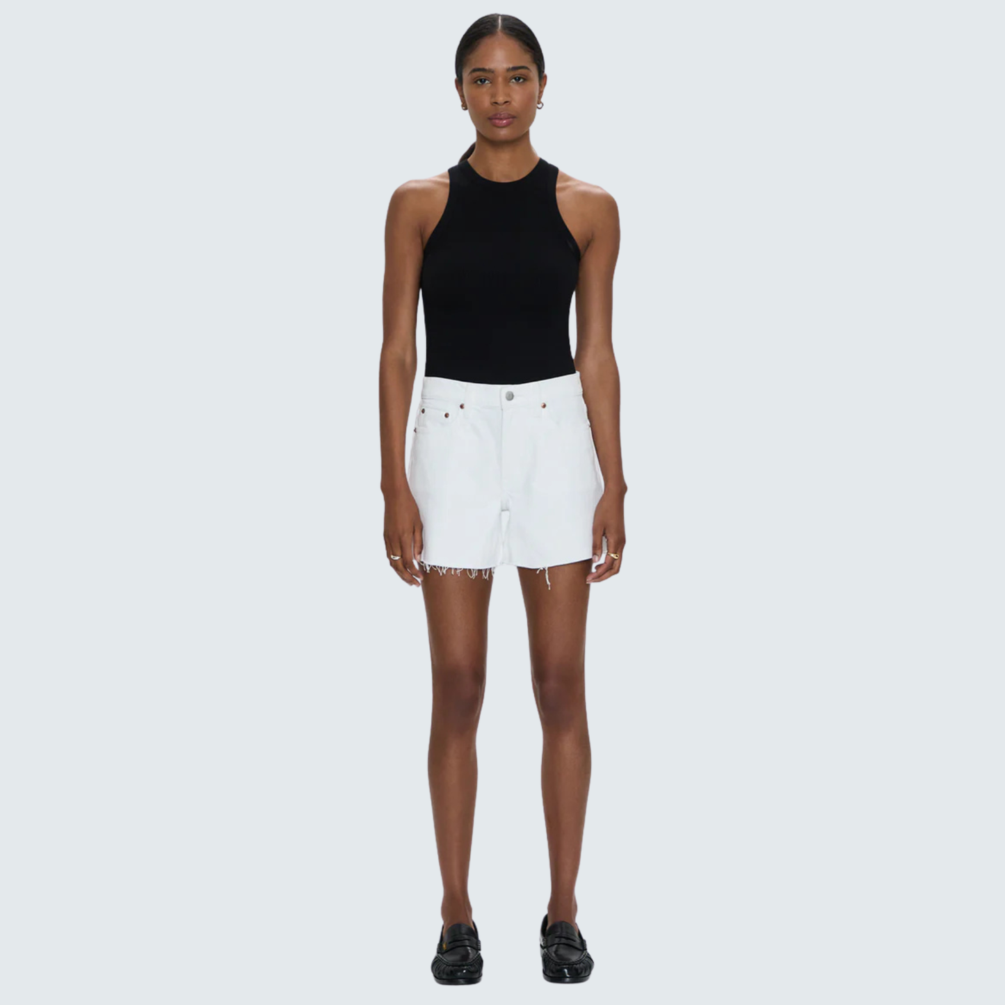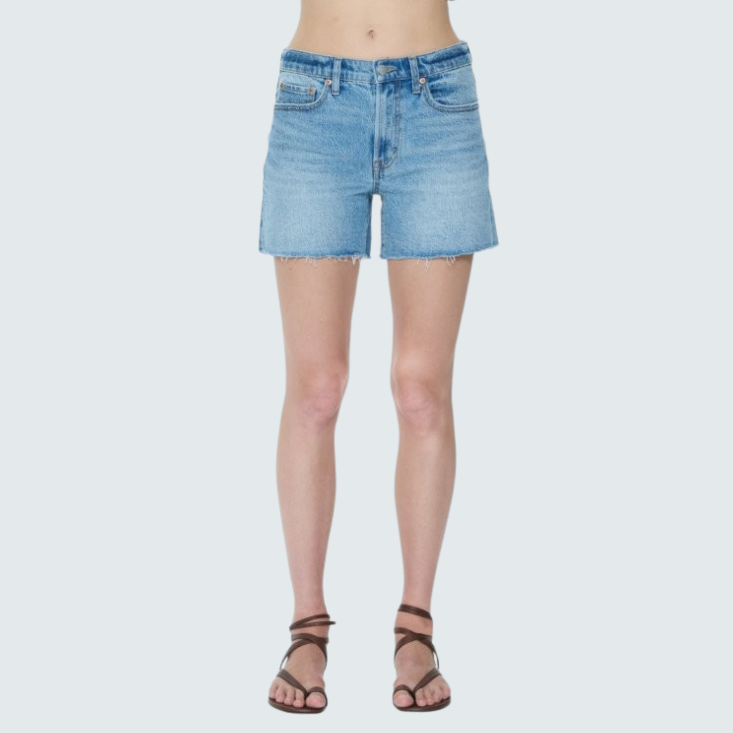 Key Features: Women's medium length mid-rise cutoff shorts with a frayed hem