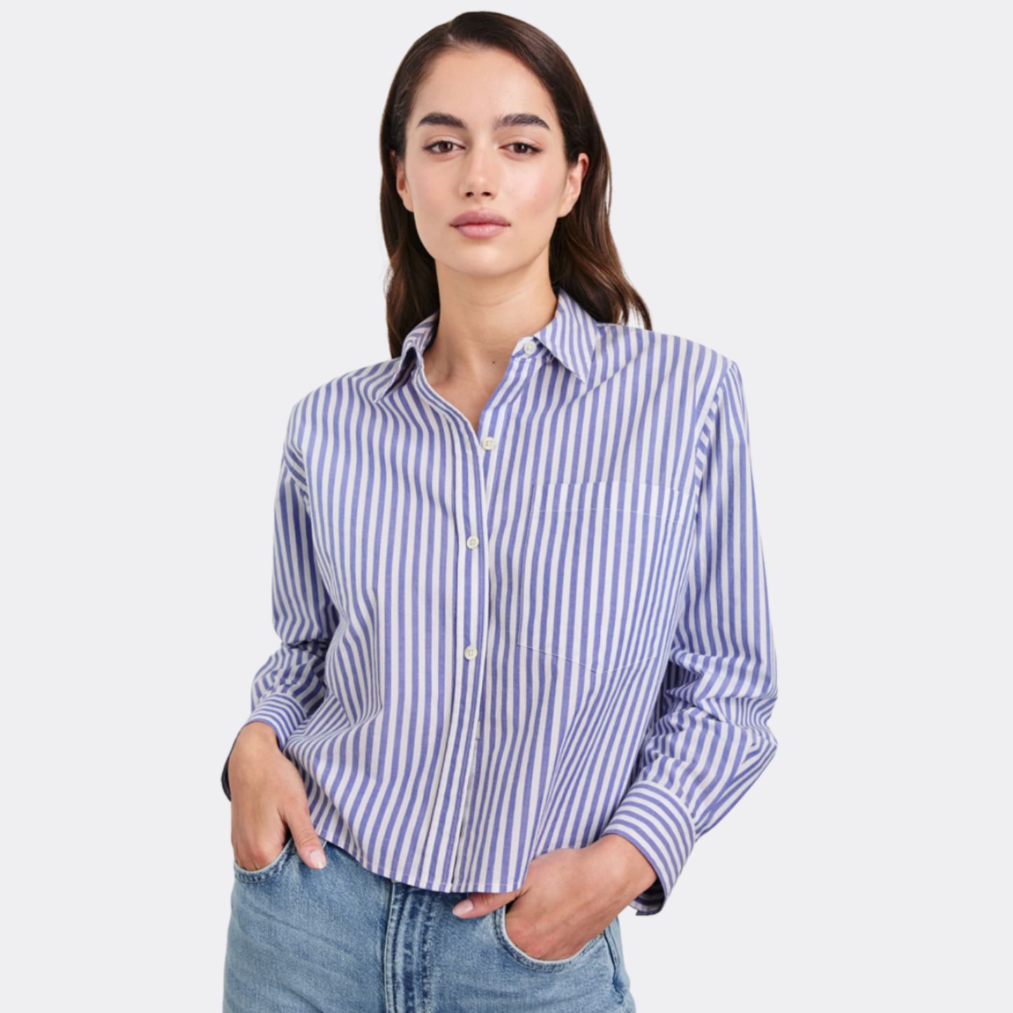Women's cotton poplin button up shirt with a shorter hem and single chest pocket