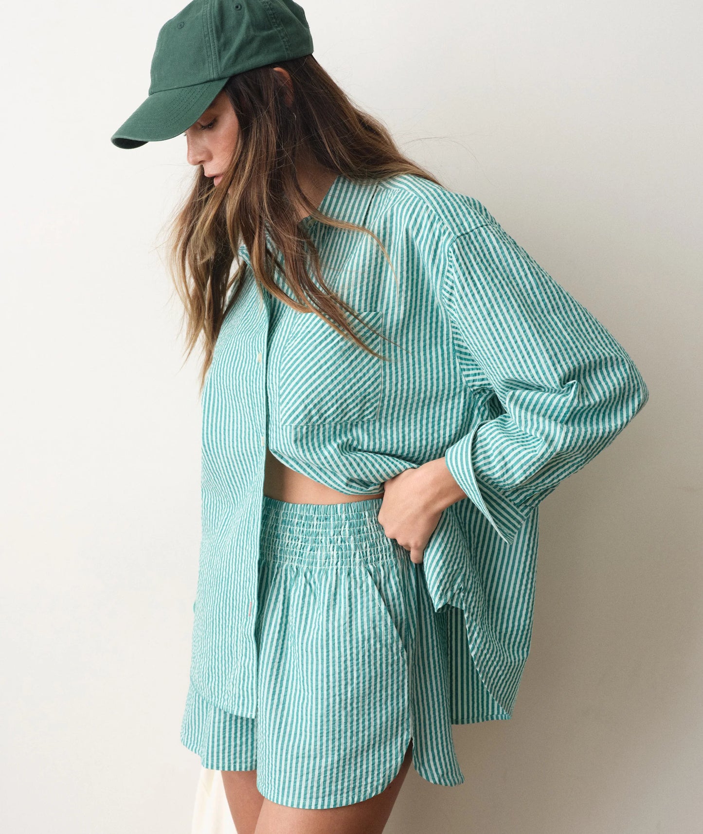stband seersucker stripe shorts with a side scallop hem