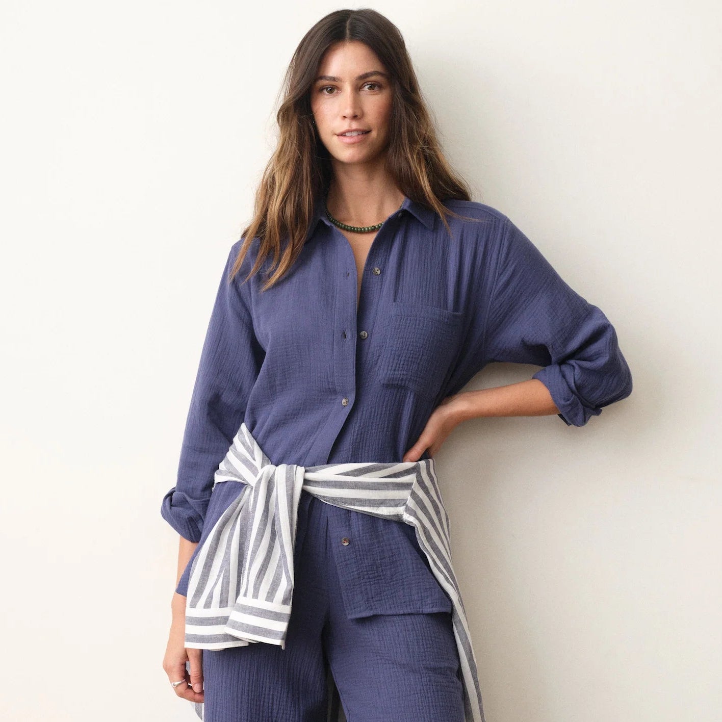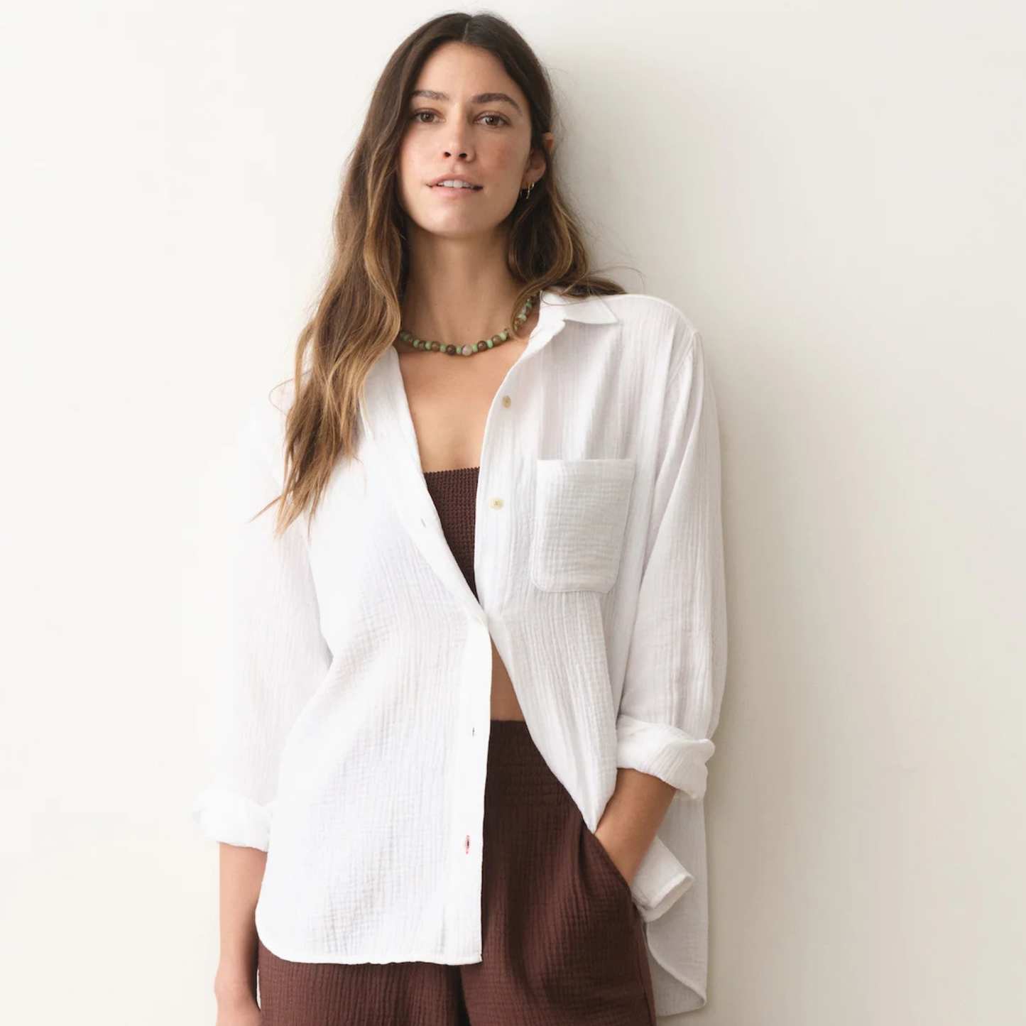 A women's button up shirt from Marine Layer, offering a light and airy wrinkle-proof layer for warm-weather looks.
